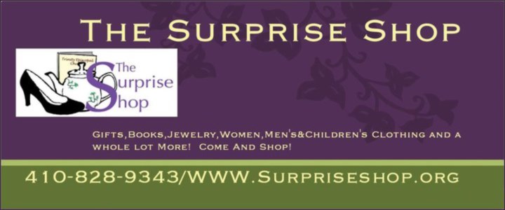 Volunteer availability is impacting our operating hour. Before coming to visit us at the Surprise Shop please call 410-828-9343, to confirm we are open for business that day.